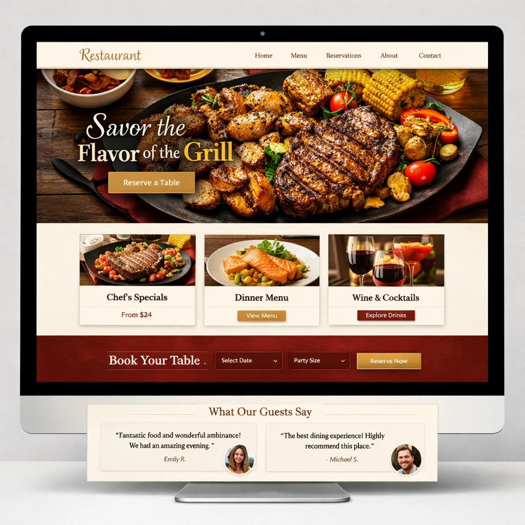 طرح مفهومی از یک رستوران آنلاین با نمایش محصولات، دسته‌بندی‌ها، دکمه خرید و طراحی مدرن.  طراحی سایت‌های فروشگاهی مانند ووکامرس مناسب بوده و تجربه کاربری ساده و جذابی را نمایش می‌دهد.