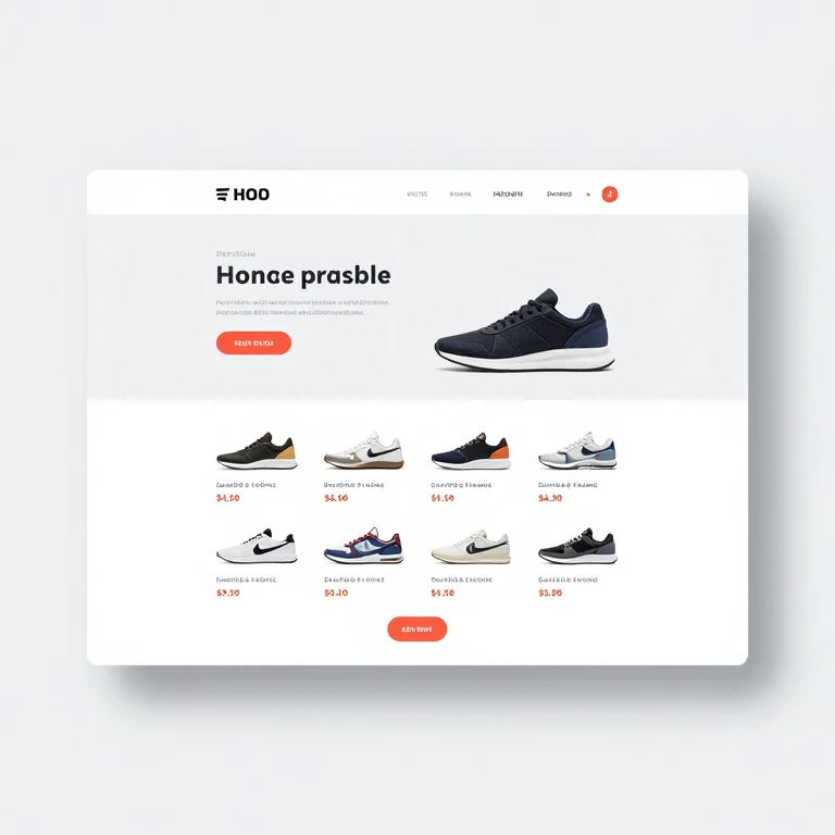 طرح مفهومی از یک وب‌سایت فروش کفش با نمایش محصولات، تصاویر کفش، قیمت و دکمه خرید. این موکاپ نمونه‌ای از طراحی فروشگاه آنلاین مدرن برای برندهای کفش و پوشاک است.